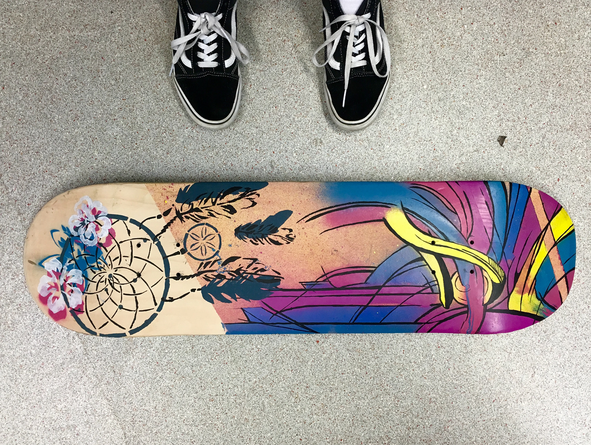 Here is a skateboard deck design I made for a friend based on a painting/edit I had previously done. I skateboard deck was created using a combination of freehand lines and shapes as well as stencil work.